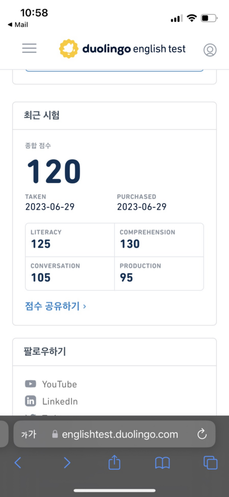 사실 스피킹 중에 시선도 한두번 위로 올라갔고, 시험 끝나고 보니 맥 기본 메일 앱이 켜져있었던 터라(계정은 미로그인상태) 다시 쳐야할 줄 예상하고 짜증나 있었는데(시험은 다 싫어용) 성적이 나온 것만으로도 상당히 기뻤다.